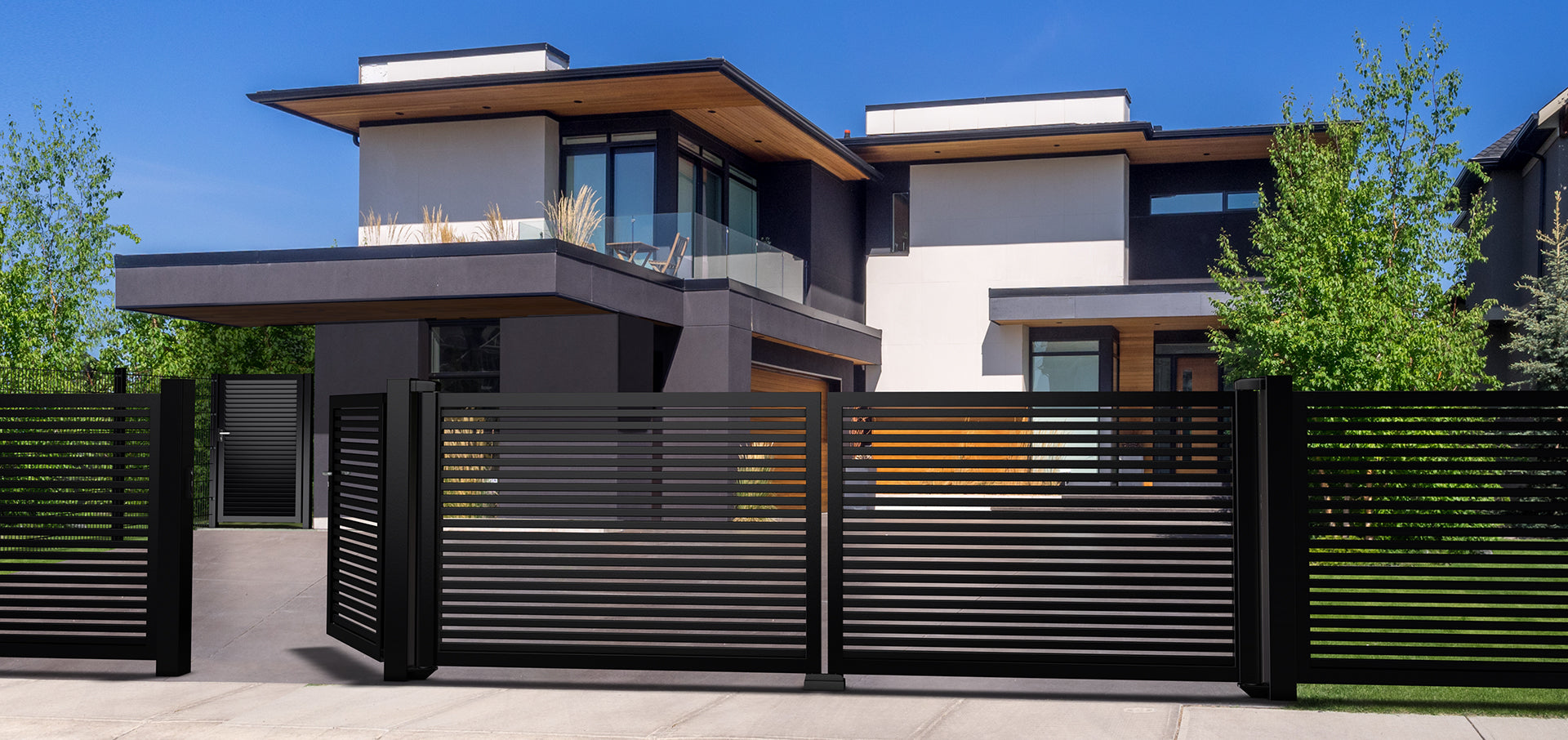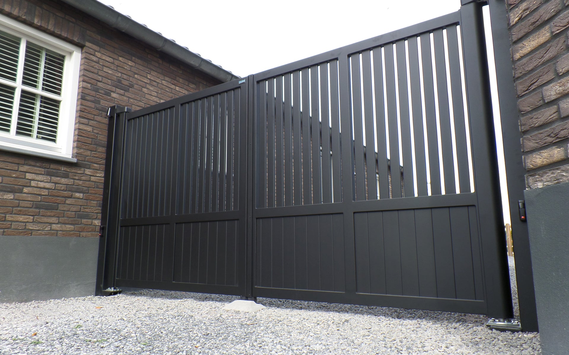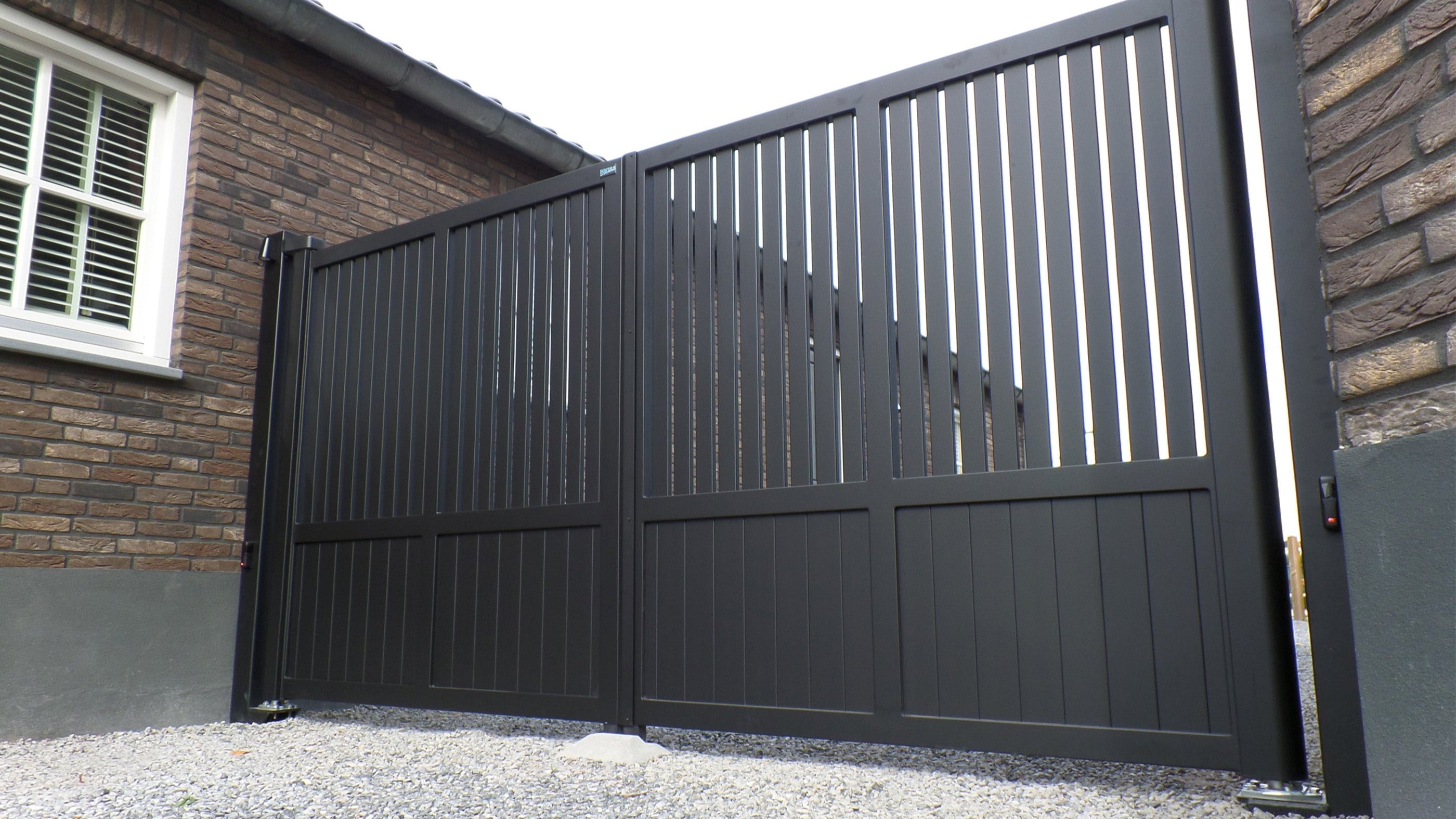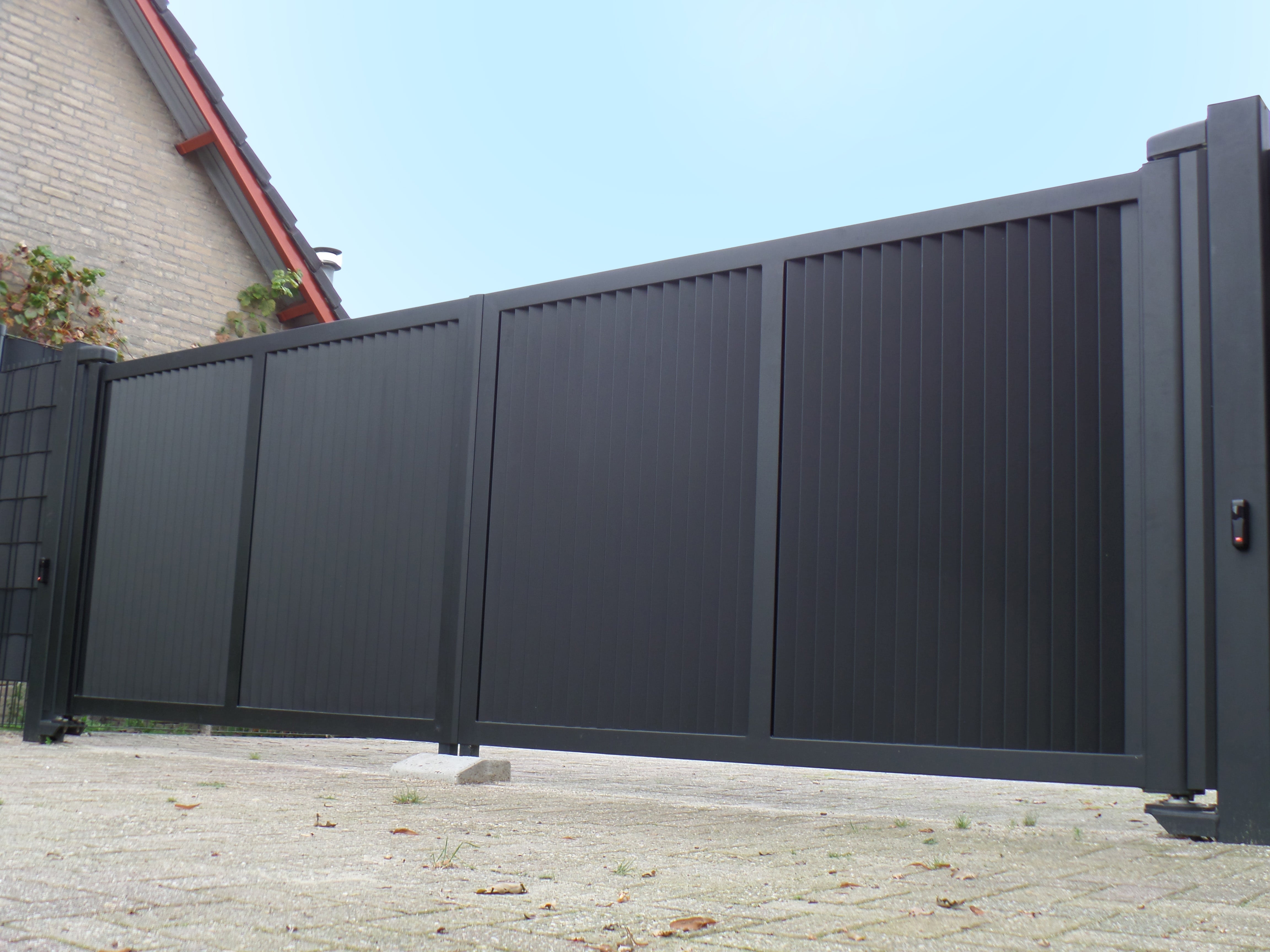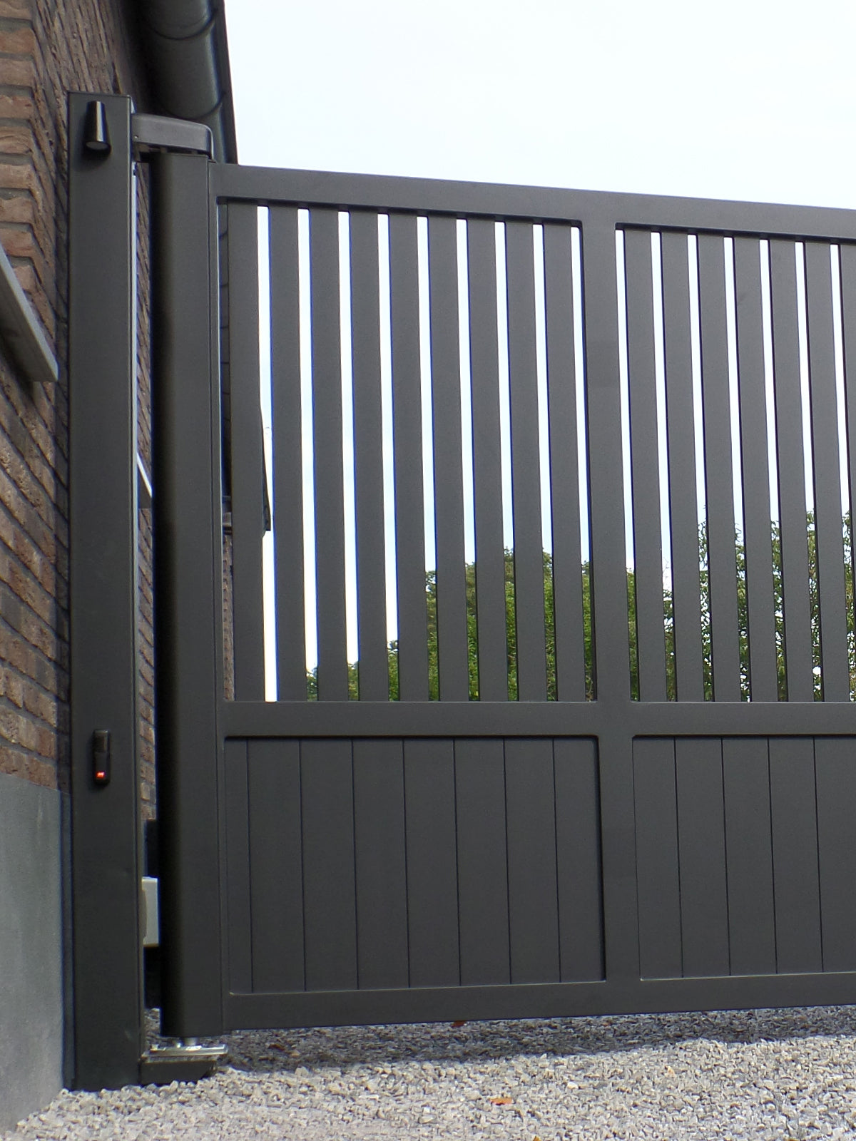 De poort is gemaakt van hoogwaardig aluminium. Licht, sterk en bestand tegen weer en wind. En wat ook telt: hij oogt strak. Zakelijk of particulier? De stijl past zich moeiteloos aan.
