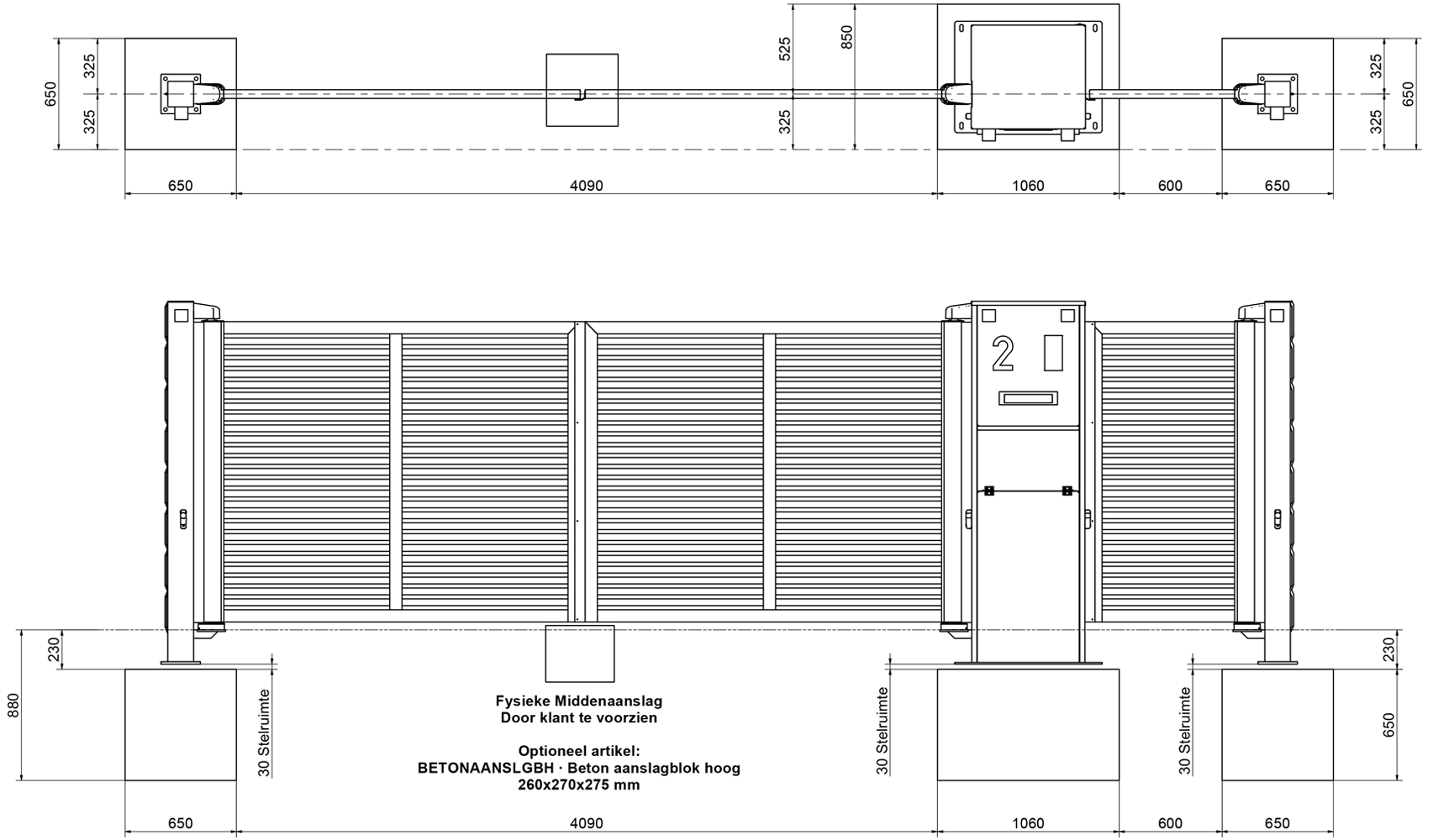 Je Modius Invisio poort wordt volledig elektrisch aangedreven, geassembleerd en CE-gekeurd geleverd. Als klant ontvang je vooraf een fundatie- en ankerplan. Hierop staat precies waar de palen komen, hoe groot de betonblokken moeten zijn en waar de draadankers geplaatst worden. Geen giswerk. Geen verrassingen.